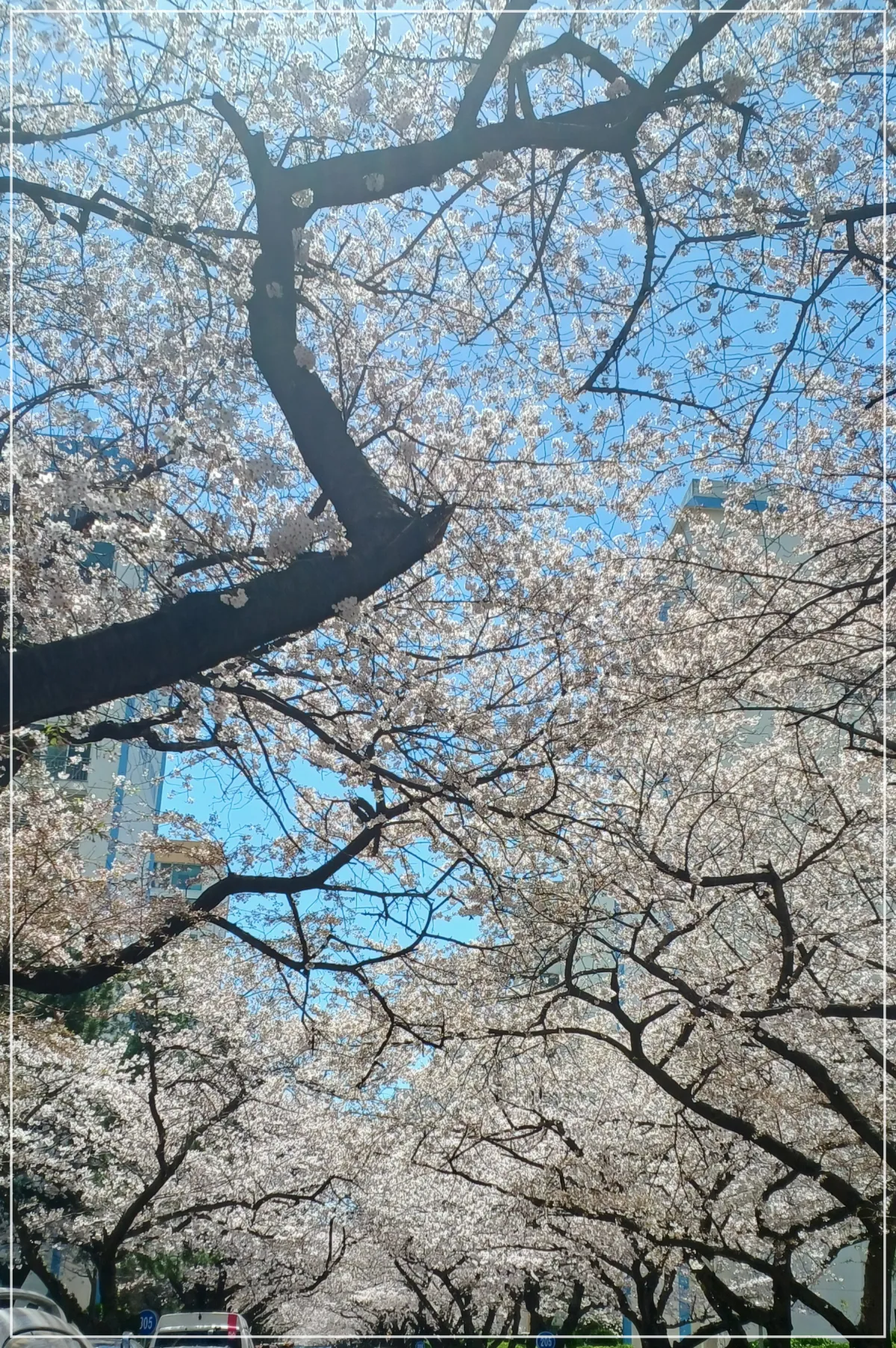 벚꽃나무 특성상 어느정도 큰 나무는 이식이 불가하기 때문에 대부분 작은 나무를 심거든요. 그래서 처음 몇 년 동안은 벚꽃도 크지 않고 많이 피지도 않습니다. 그런데 삼익비치는 79년에 완공된 아파트로 40년도 넘었습니다. 그렇기 때문에 벚꽃나무도 그만큼 오래되어 가지를 길게 뻗어 벚꽃터널 장관을 만든 것이죠. 아마 전국에 이런 장관은 없을 거예요.