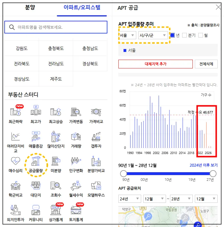 아실 앱이나 사이트로 들어가셔서 공급물량을 클릭하고 알고싶은 지역을 선택하면 다음과 같이 과거부터 앞으로 3~4년 뒤의 공급물량이 표시되어 나옵니다.